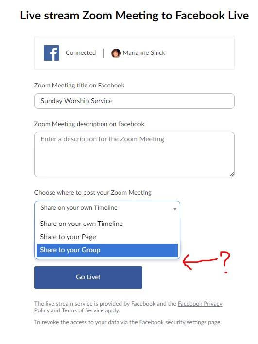 I cannot get Zoom to give me the option to "share to a page I manage" for Facebook. I used to get this option. Screeenshot attached. Thoughts?