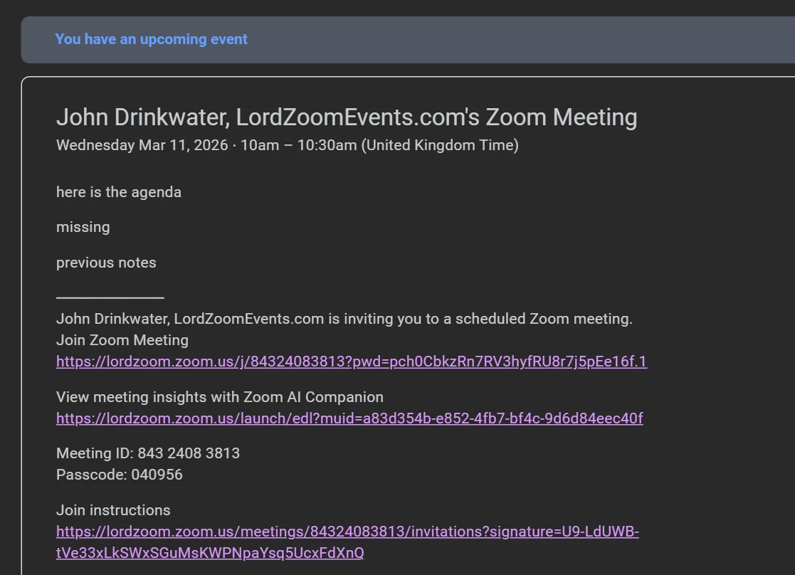 I understand it’s in the ICS attachment but sometimes I don’t want to add it to my calendar. I just want to know when to call. Not to mention sometimes in forwarding the attachment is dropped.
