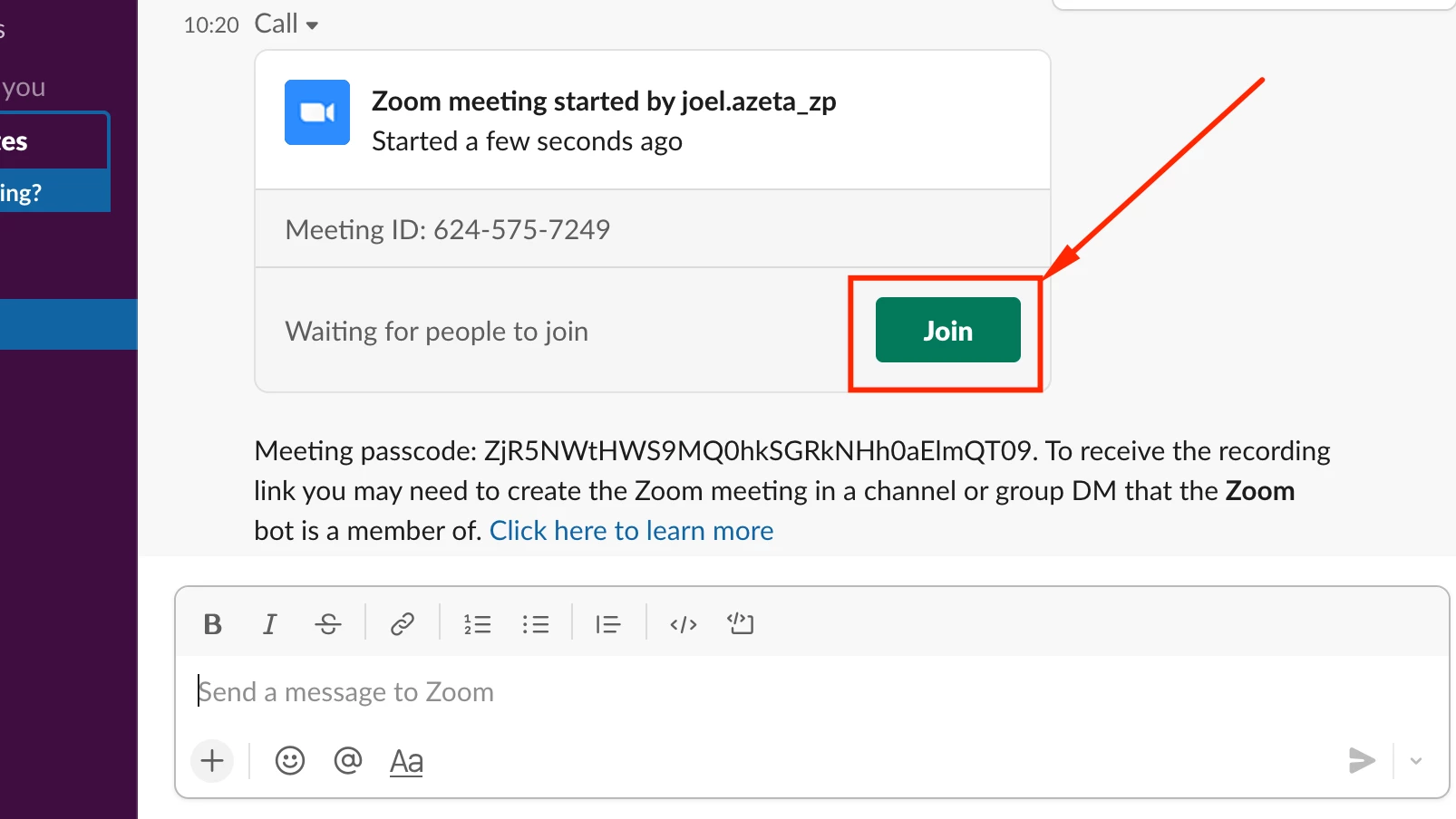 Starting Zoom calls from within Slack