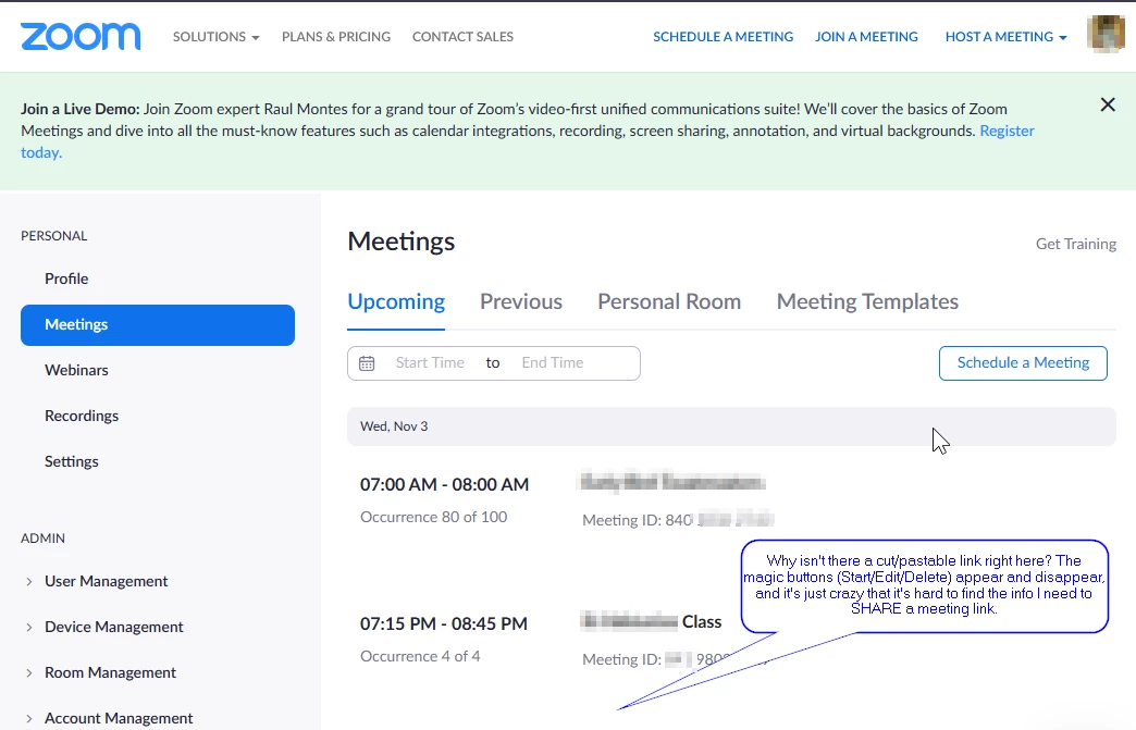 I'm posting this because I use Zoom for two organizations I work with. I know Zoom's focus is likely on the relevant factors relating to the virtual conferences themselves, but I'd like to suggest some needed improvements to the website itself.