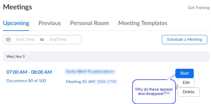 The "now you see them, now you don't" buttons are an additional aggravation. Why aren't these just links next to each meeting in the list, rather than something that shows up or not based on where my pointer is?