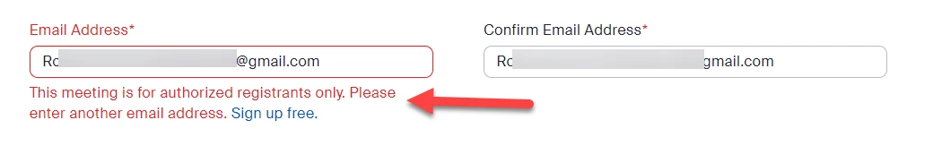 trying to register to a meeting and its not accepting the email address