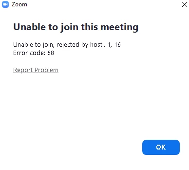 Unable to join this meeting, reject by host, 1, 16 Error code: 68