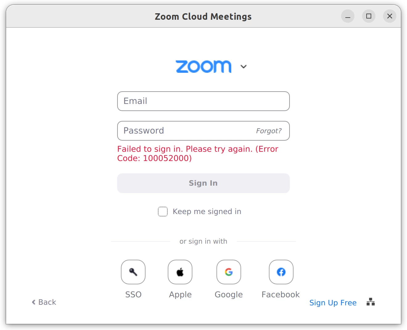 Used SSO to signin into zoom, always show "Failed to sign in. Please try again. (Error Code: 100052000)"