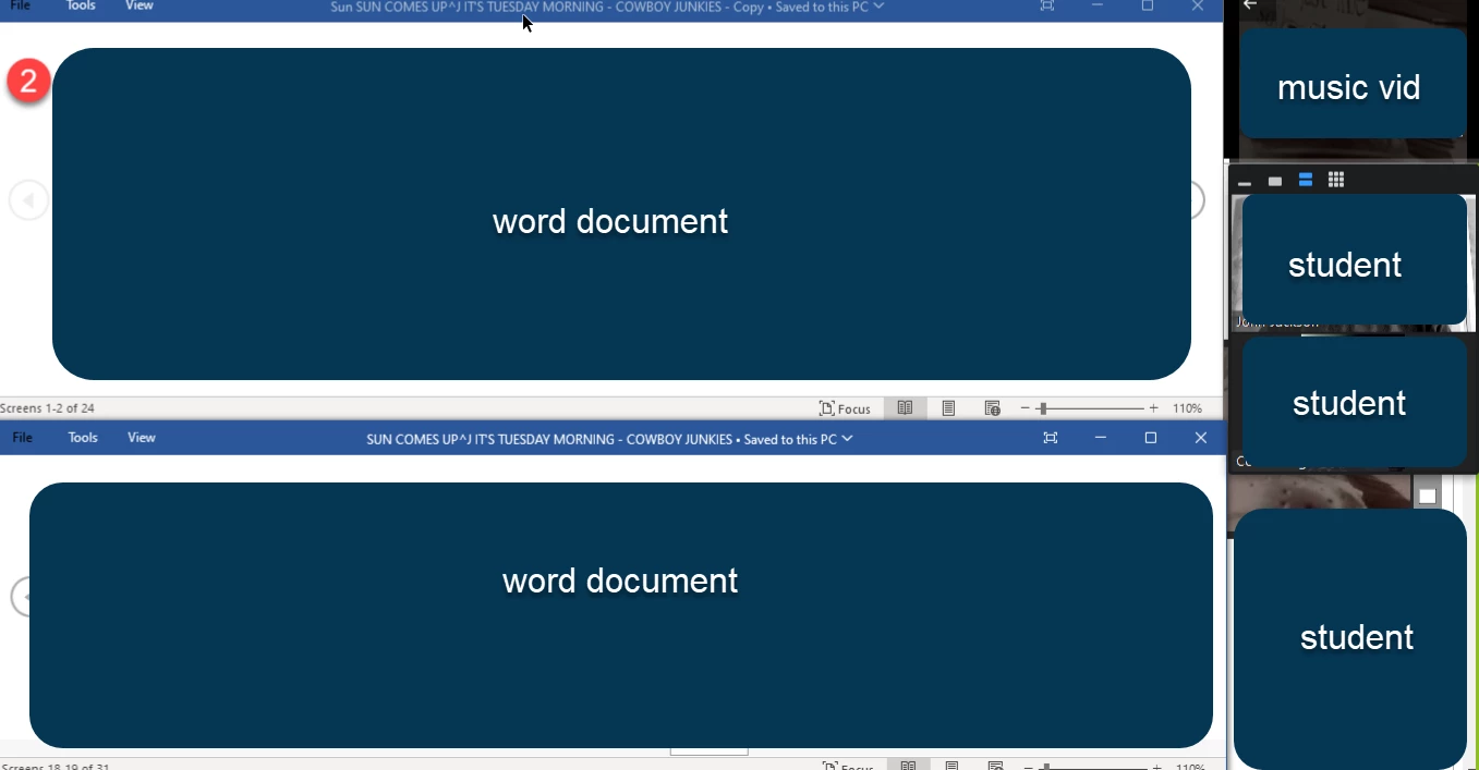 Probably this requires OBS but hoping someone has some ideas. I will be teaching conversation using a music video. I wish to screen share as per the attached image. Two word documents open and on the side the music video. Below I'd like to have teacher and the student answering the question appear. Then another student replace the first. And so on. All students can see Monitor 1. Teacher can see students in Monitor 2. Any possible way to open multiple windows on the desktop and accomplish this? Or any ideas on how to do this without dual monitors. I understand that there is a side by side option but it does not work with dual monitors. Any suggestions appreciated. Mostly trying to find out if this is impossible and if so, work arounds. Will tackle OBS down the road. Thanks.