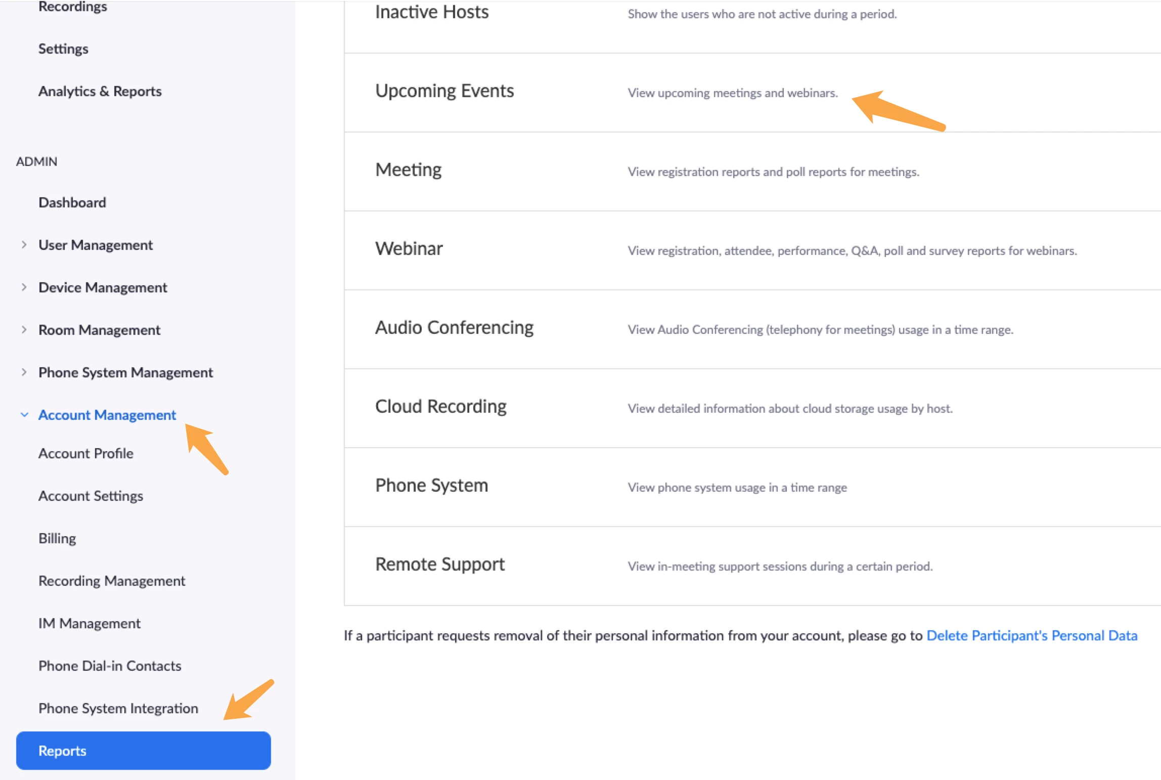 Correct, the reports lets you view previous meetings along with usage and statistics. There should separately be an upcoming events feature. If you want to see all upcoming meetings in one place it may be best to use APIs to extract the meetings form your users and view them in one central dashboard. If you are not a developer there is a Zoom app, Salepager, that lets you do this.