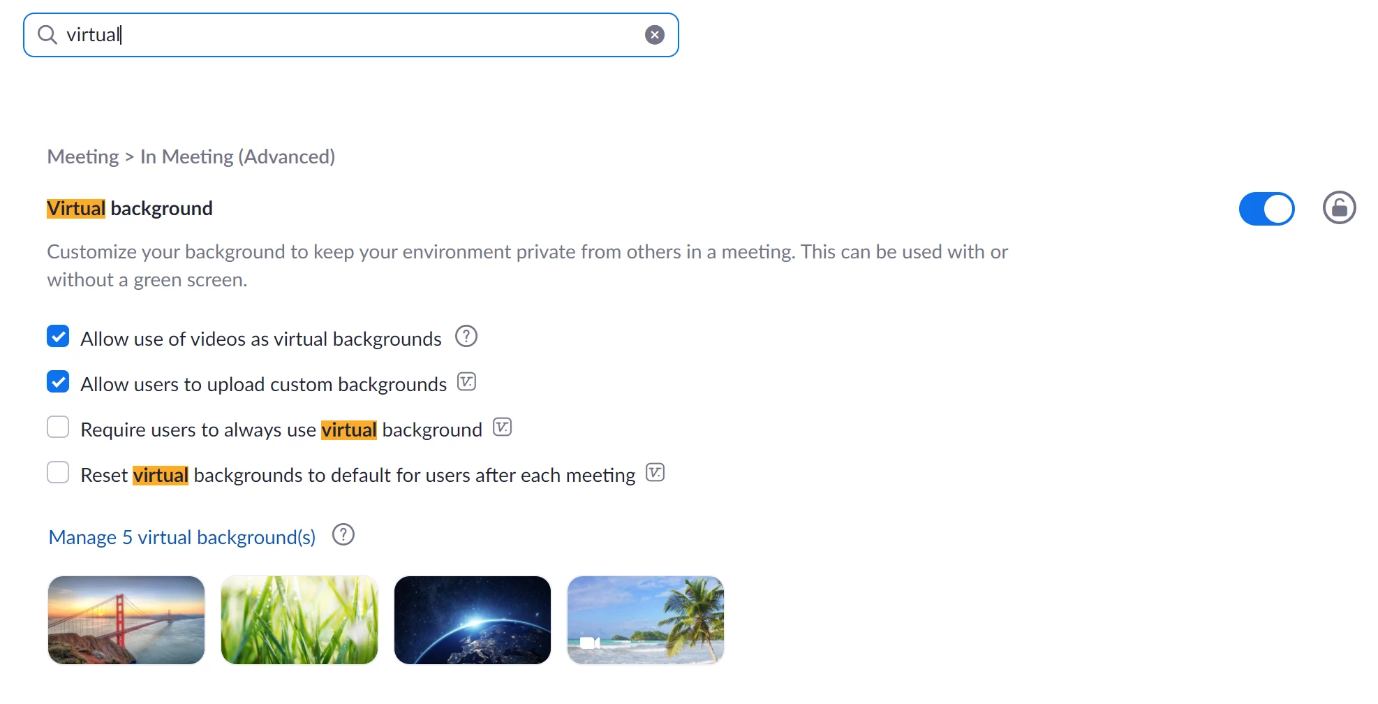 The virtual background I have selected does not save from session to session. I want the same background for almost all my Zoom meetings but the selected background does not "save". I have to reselect it it every session.