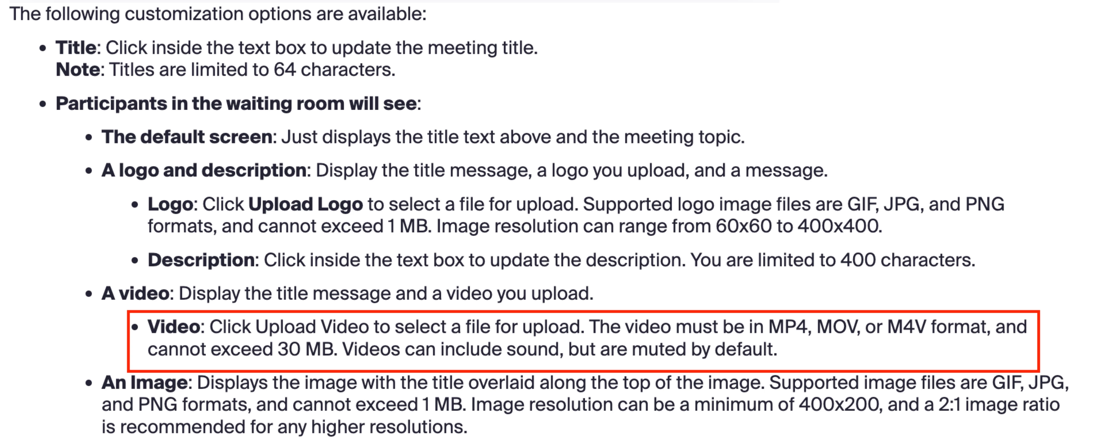 I've been trying to upload video to the Zoom Waiting Room for several weeks now, and have tried everything. My video is the right type and the right size. I can upload it, but when I click Save the system tells me "Video Upload Failed". I have tried multiple different videos (all the right type and size). I have the latest and updated version of Zoom. I have logged out and back in. I have turned off the Waiting Room and turned it back on (in conjunction with logging in and out). Any other ideas? Thanks!