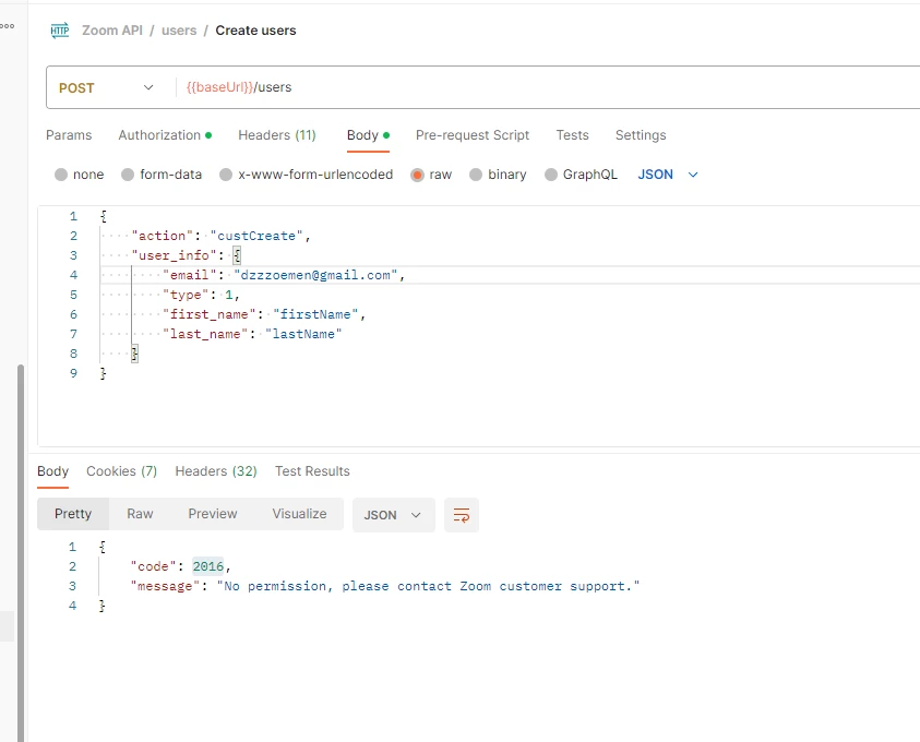MmoemengaballaNewcomerForum|Forum|2 years agoJune 1, 2023QuestionWhen try create user get response No permission, please contact Zoom customer support.Forum|Forum|2 years agoJune 1, 20231 reply3 viewsWhen try to create a user get the response No permission, please contact Zoom customer support.Can anyone help me, please? this API was work fine before a few days or month. IntegrationsOther