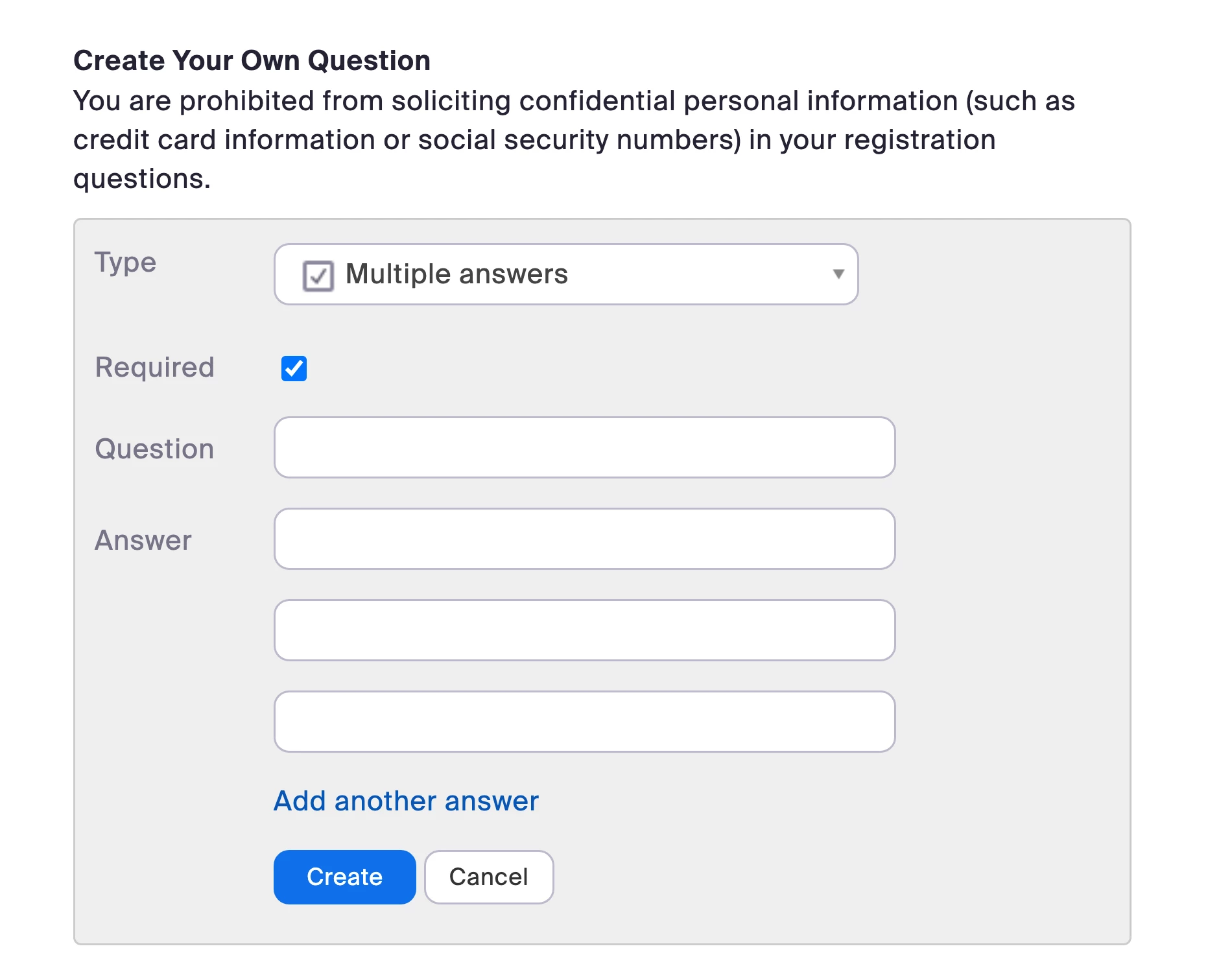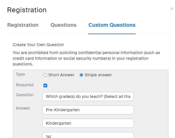 When entering custom registration questions, why is there no option for multiple answers for a meeting (not webinar)? There are only "Short Answer" and "Single Answer."