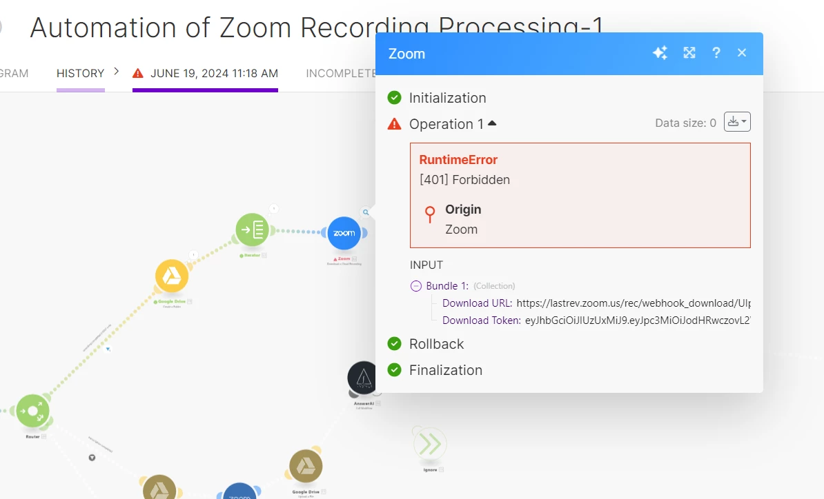 Zoom 401 forbidden error in Make.com Workflow