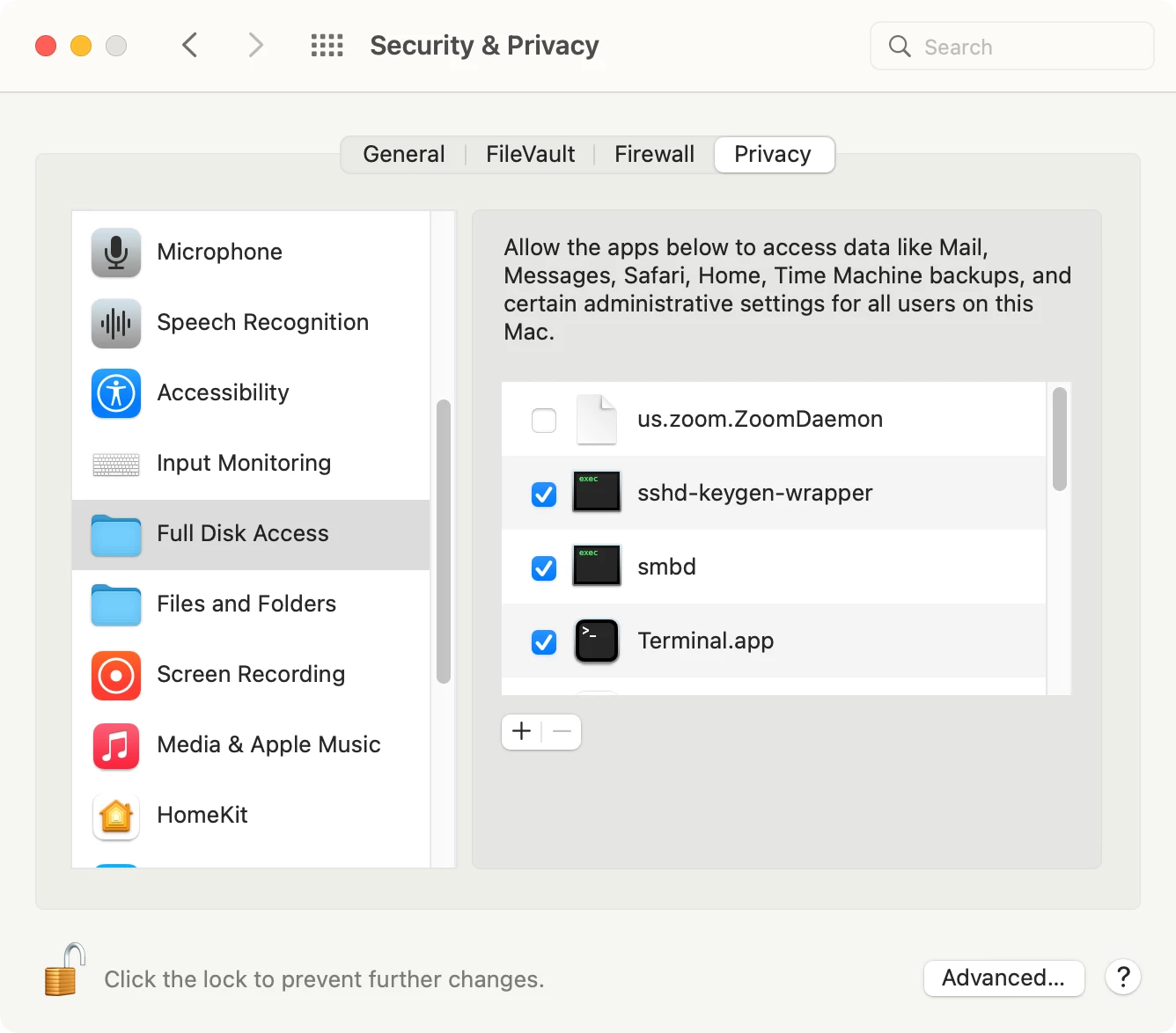 I searched the help topics and couldn't find an answer as to why Zoom might need full disk access in System Prefs > Security & Privacy > Privacy. I understand of course why it needs camera/mic/screen recording access, but not this.