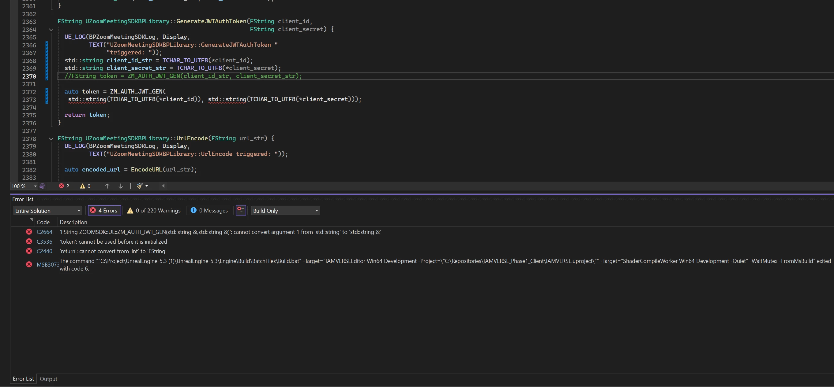 Error C2664 'FString ZOOMSDK::UE::ZM_AUTH_JWT_GEN(std::string &,std::string &)': cannot convert argument 1 from 'std::string' to 'std::string &' C:\Repositories\IAMVERSE_Phase1_Client\Plugins\ZoomMeetingSDK\Source\ZoomMeetingSDK\Private\ZoomMeetingSDKBPLibrary.cpp
