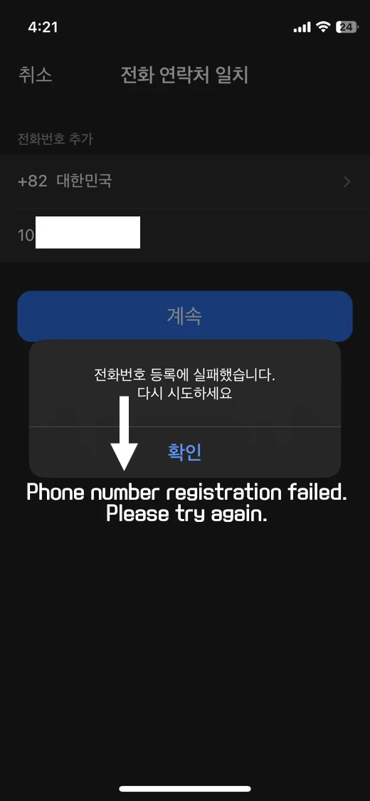 As a result, I received a message "Phone number registration failed. Please try again.".