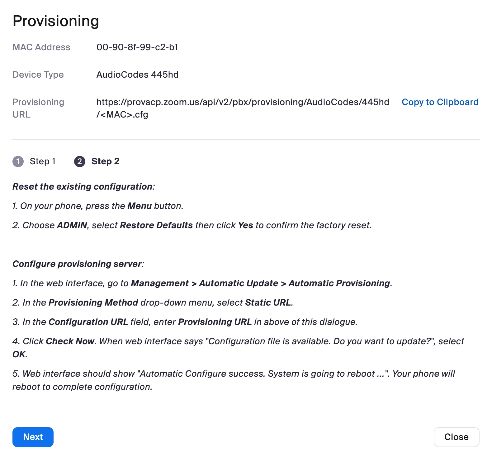 I'm attempting to provision an Audiocodes 445hd desk phone. Automatic provisioning didn't occur after resetting the phone so I went through the manual steps to provision.