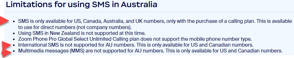 Does anyone know if SMS for Zoom Phone Australia is unlimited texting or know the rate per text for AUS to AUS texting? Support keeps directing me to the international PBX rate page, but these are US to international I am pretty sure. This is a really good article https://support.zoom.com/hc/en/article?id=zm_kb&sysparm_article=KB0057987 on setting it up and limitations, but doesn't cover costs, if any, for Australia SMS. Any help would be appreciated!