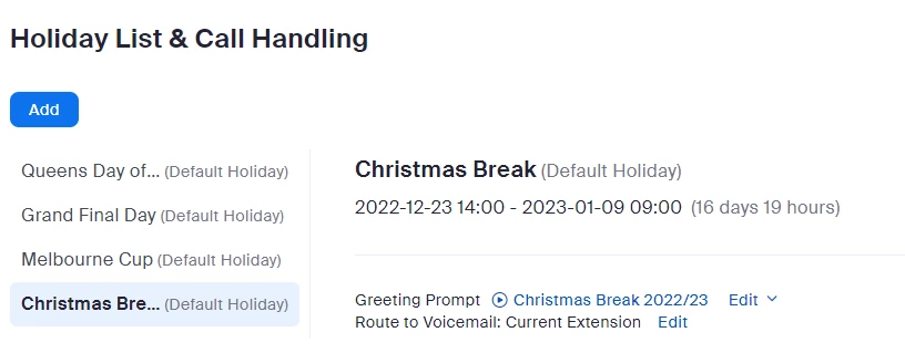 Web portal > Phone System Management > Company Info > Choose your Site > Settings > Default Holiday Hours