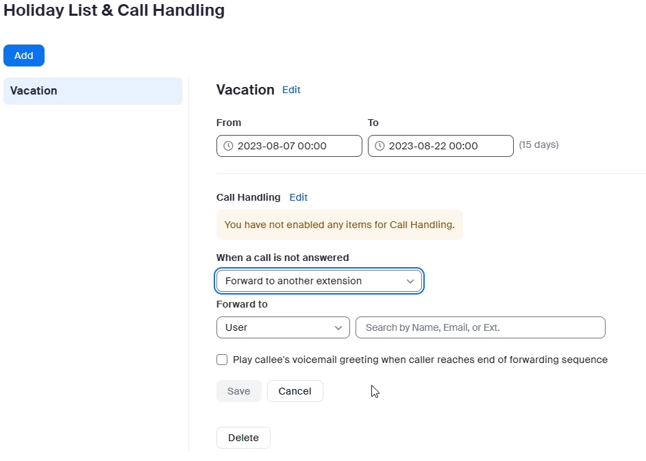 Hi, all. I am going on vacation and need to reroute my calls to another person on our team. I tried to use the delegate feature and it didn't work...any suggestions on how to proceed? I am the admin.