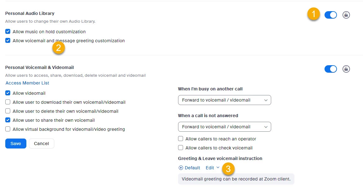 Hmm, in Account Management/Account Settings/Zoom Phone, is Personal Audio Library enabled? I could see that being disabled keeping you from customizing a user's voicemail message....