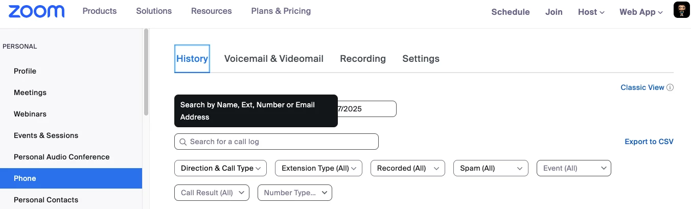 I am wondering if there is a way to search my call history for a specific number using the Zoom Workplace phone system.