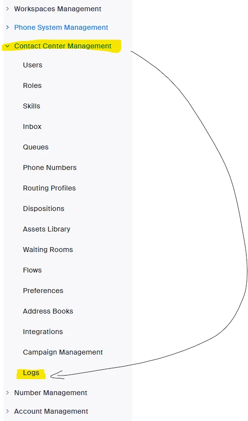 2) From my previous screenshot (and the new one below) I am showing you what the "Zoom Contact Center > Logs" looks like in your Zoom Portal.