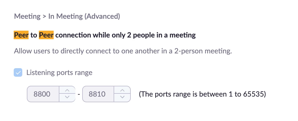 Does anyone know what port range is used when a zoom client calls another user answering on a zoom client? it doesnt use the 20k+ range that goes back to zoom but uses TCP ports somewhere in the 9000+ range from testing with wireshark.