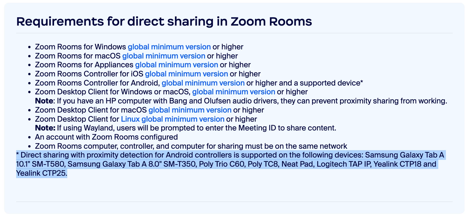 Does anyone know which Zoom Room controllers do or do not support this feature? Logitech Tap (direct-connect and/or Tap IP), Neat, iPad, etc?