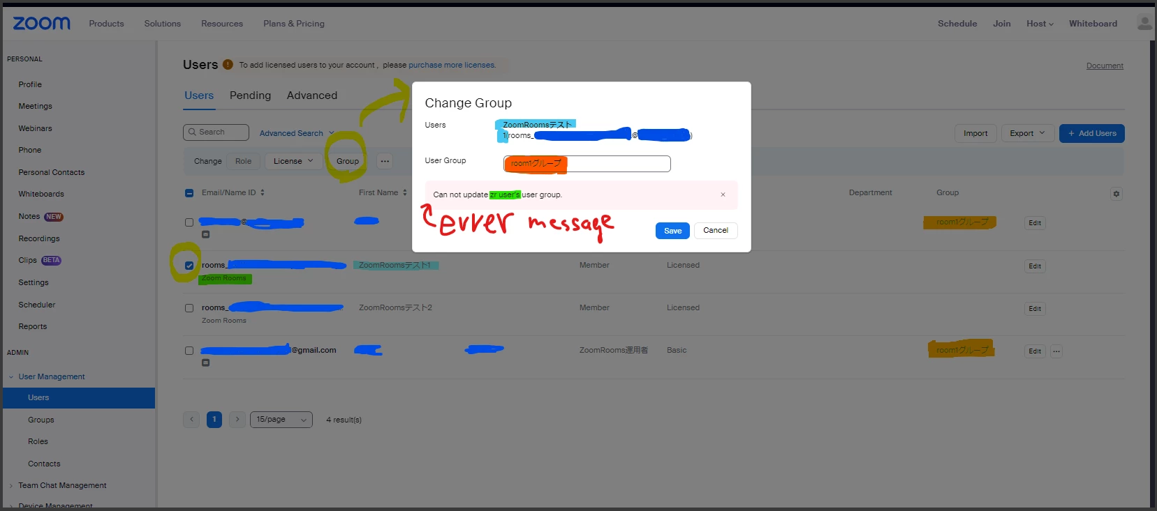 I want to add a ZoomRooms license user to a group, but it fails.