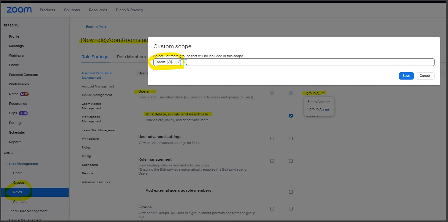 This is because I want to create a new role that can edit user settings only for groups that include ZoomRooms license users for security management within my company.