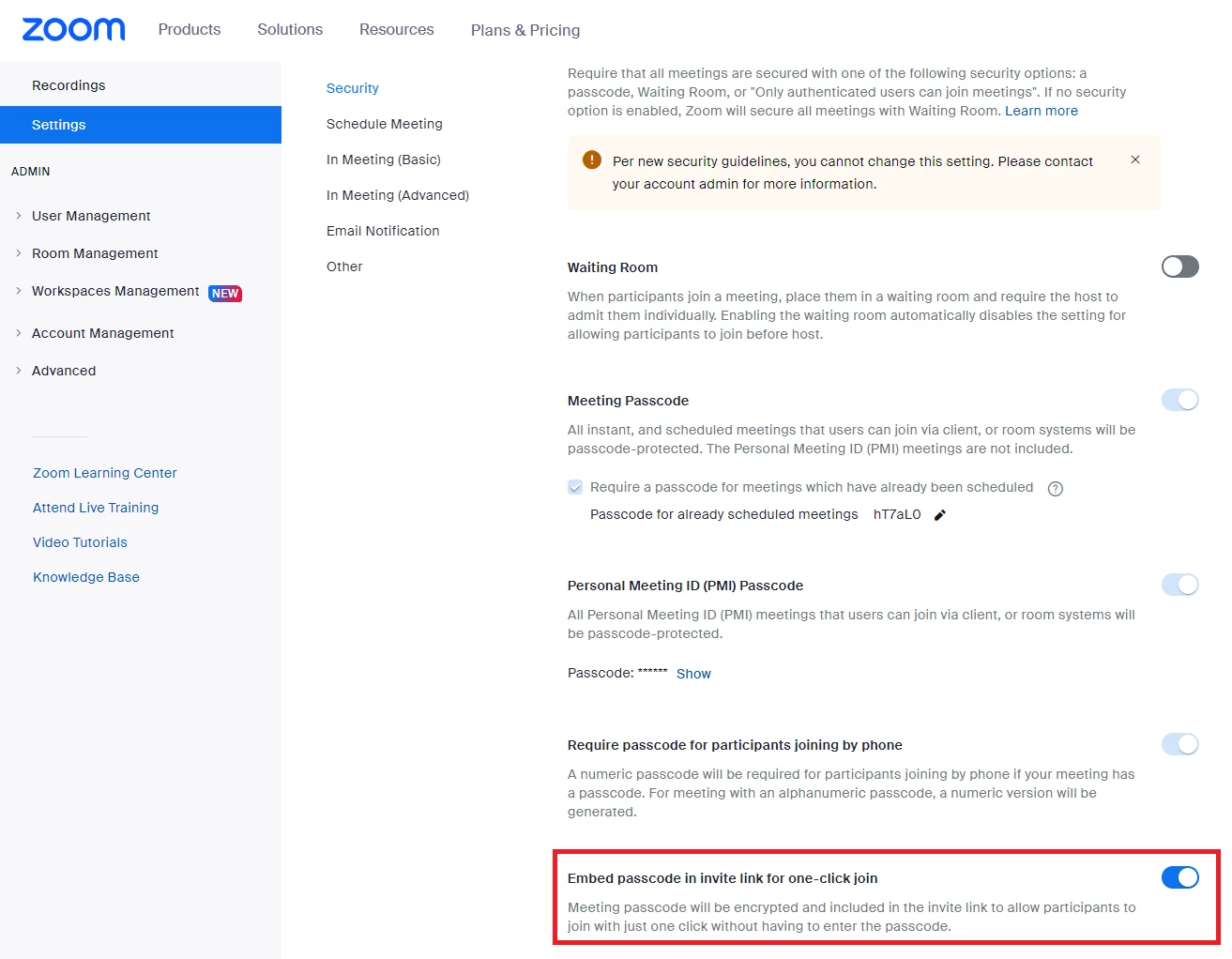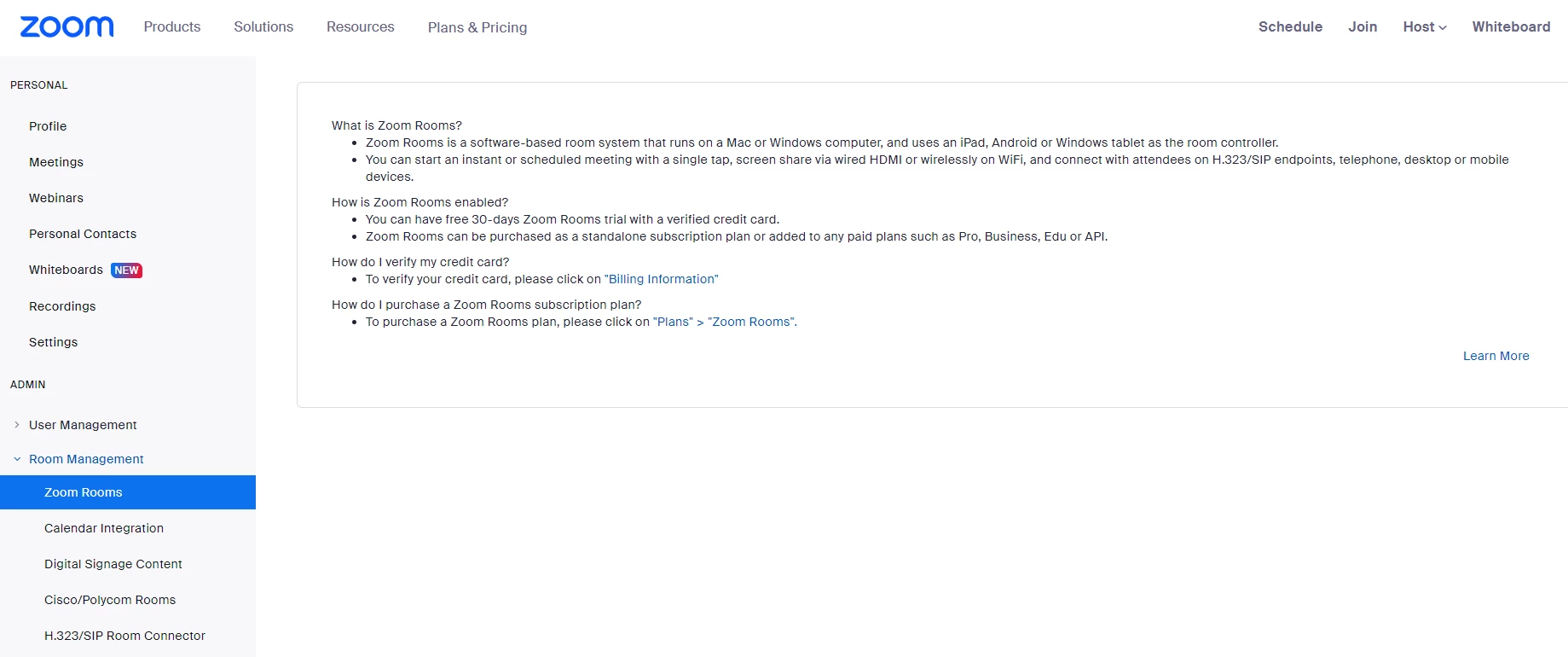 1. Sign in to the Zoom web portal as an admin with the privilege to edit Zoom Rooms settings. 2. In the navigation menu, click Room Management then Zoom Rooms. 3. Use the Zoom Rooms location hierarchy to enable third-party conferencing dial-in for Zoom Rooms from the account, location, or room settings. For this example, click Account Settings.