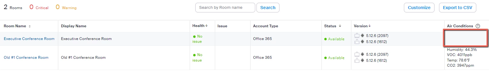 However, nothing shows up on the Zoom Dashboard under "Air Conditions" for this room.