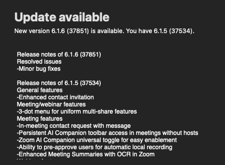 Hi I can't join any Zooms using Zoom Workspace because it keeps saying that I need to update the app to version 5.16.6 or higher. I'm pretty sure I've downloaded the latest version and I don't know how to update to another version. I tried attaching screenshots but can't seem to do that.