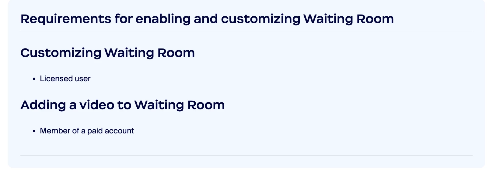 I just tried to adjust the options for the waiting room to add a video there but once I enter "waiting room" in the settings it does not showcase any options to adjust the waiting room. Just shows a toggle to add or remove the waiting room. I am on the free plan maybe that's why this occurs - don't know.