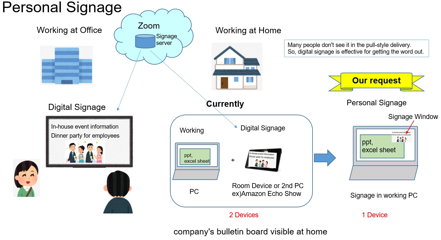 私たちは、テレワーク時代の新しいサイネージとして、個人サイネージをZoomの日本法人を通じてリクエストしました。