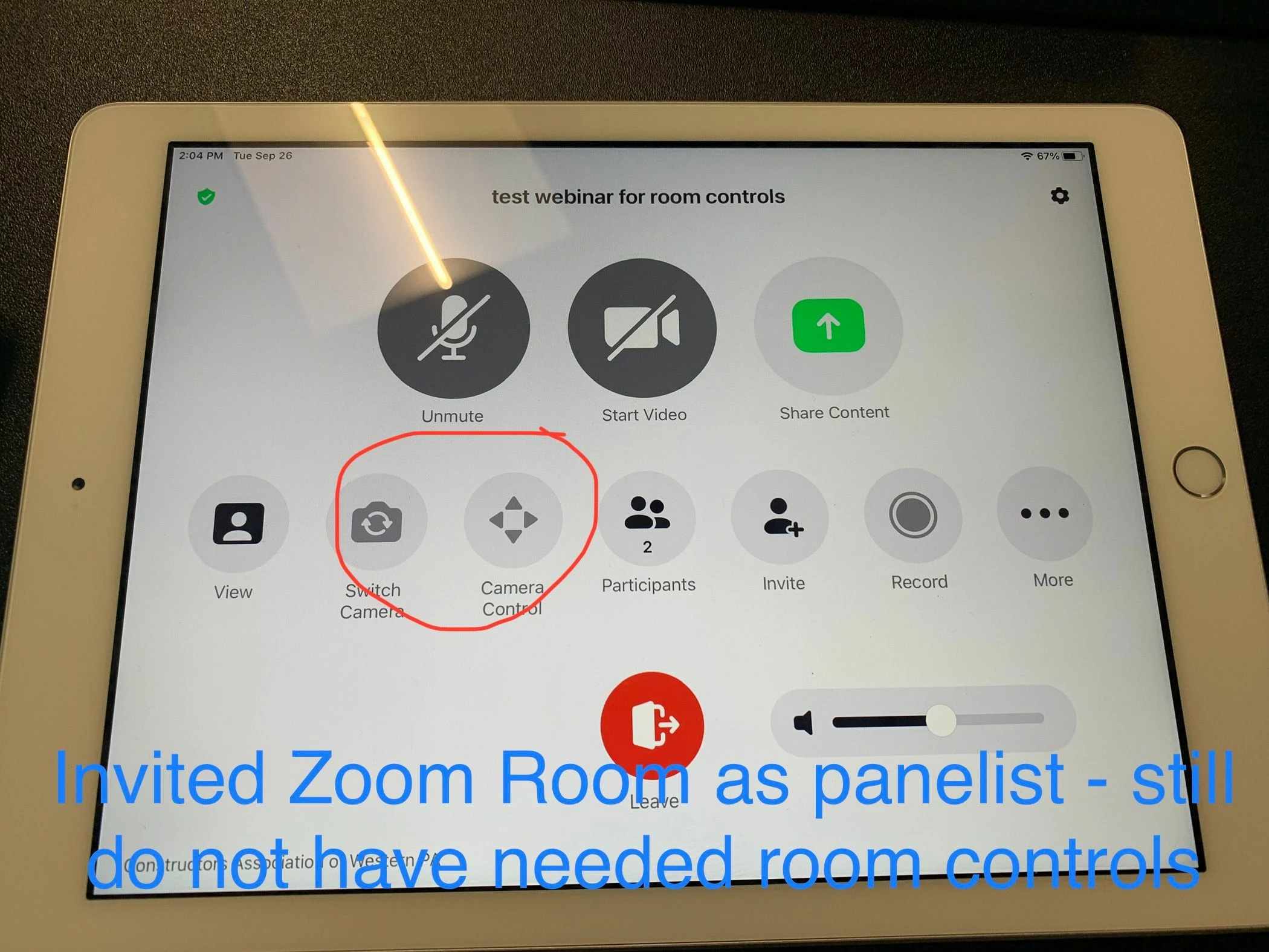 Our Zoom Room Controller app no longer has the room controls available in a webinar. We have done everything - updated the iPad, updated the controller app, had IT professionals look at our Zoom Room system, had AV professional check everything in the Zoom Room. We have conducted several test webinars even using a different device - iPhone with the Zoom Room Controller app. The room controls are simply not there anymore!