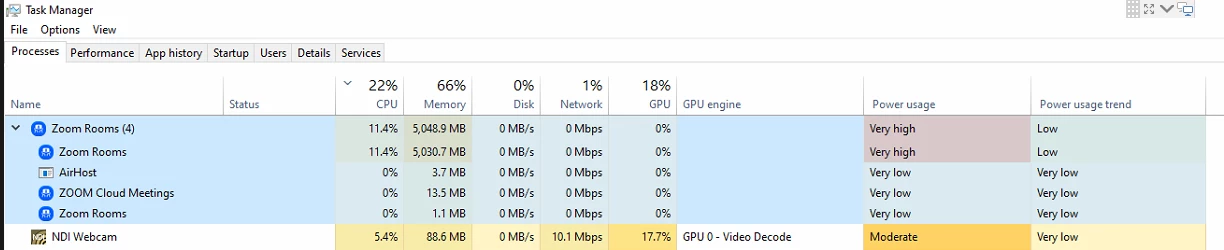 Hi I'm running the latest version of Zoom rooms and it seems really unstable - the Main screens freezing during an important meeting. As you can see the memory utilization is very high.