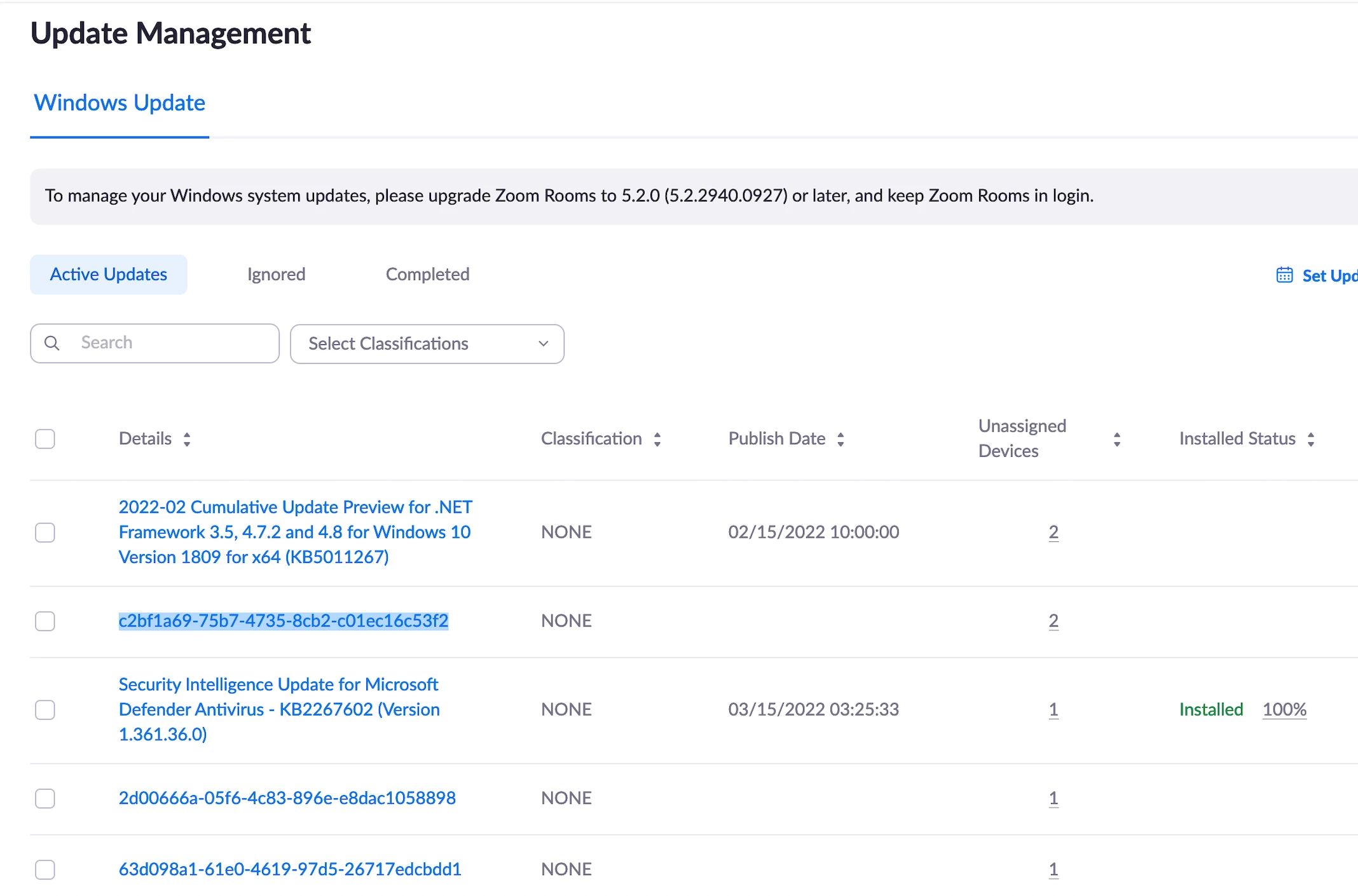 Trying to keep our Zoom Rooms using Windows based Intel NUCs updated with latest security updates. If we look in our Zoom account in https://your-company.zoom.us/device/update/manage we see updates listed to be approved/installed to our NUCs. Unfortunately, updates listed post February are named in a meaningless manner (e.g. c2bf1a69-75b7-4735-8cb2-c01ec16c53f2) so we do not know what we are approving for install. Is this Zoom wide or maybe something in our account alone. see attached image