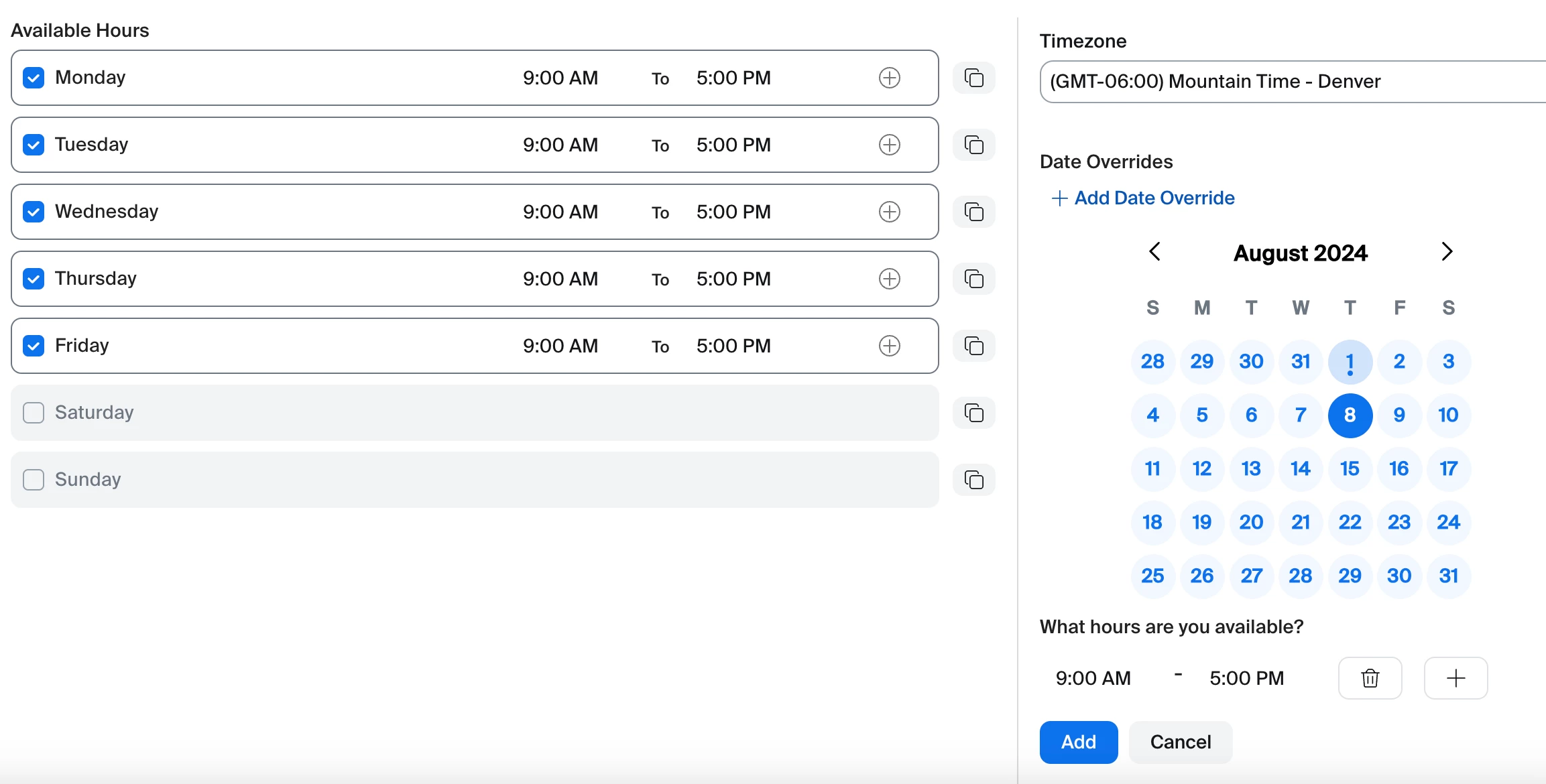 I am new to Scheduler. I have a schedule set up that is recurring each week with the same hours for availability. That was easy and I am having no issues there. What I am trying to figure out is how to block off an odd day/time where I don't happen to be available. It would be for that occasional use when I have another commitment.