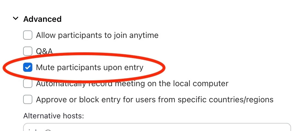 When I create a meeting, it automatically mutes participants on entry. In CREATE EVENT and clicking on ADVANCED, I see the “Mute participants on entry” default is ON. I never need this to be on. Is there any way to change the default to be off? I can’t find a way, and it’s frustrating to have to remember to uncheck it when scheduling the meeting or having to instruct participants to unmute themselves.