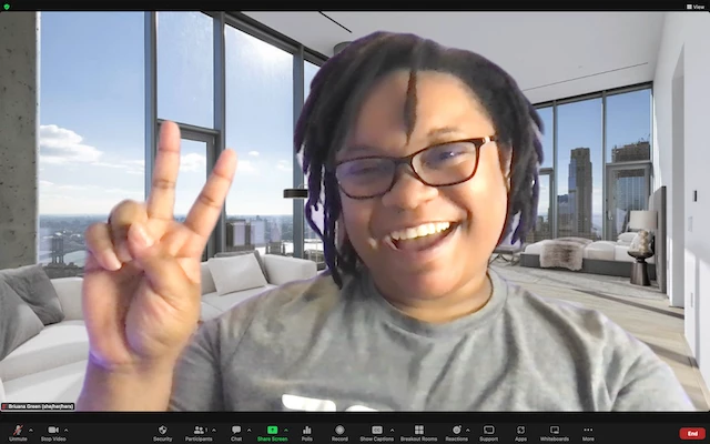 My favorite virtual background would have to be our Zoom Community virtual background. A close second would be my virtual background that looks like I’m living in a high-rise apartment building because I love a good city view.