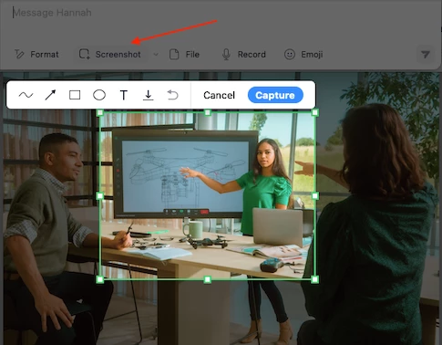 - Screenshot, annotate, and share images. Employees can share files and images in chat channels for quick collaboration. Need to get the point across visually? Use the Zoom desktop client to take screenshots, add annotations, and share them directly in chat.