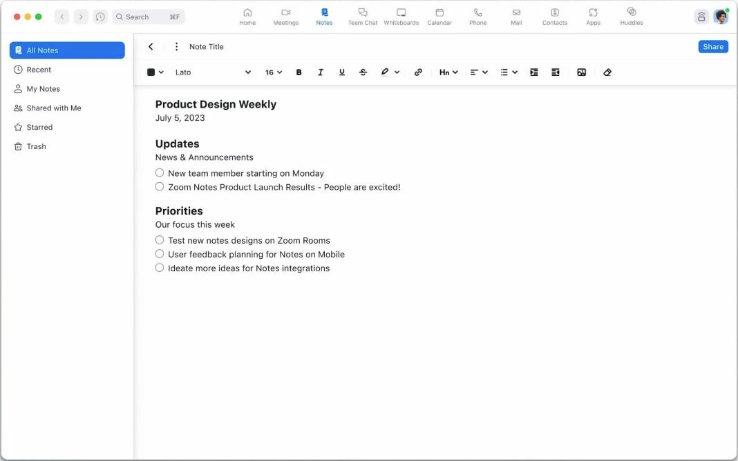 Zoom Notes provides a clean user experience that allows users to create agendas and notes while staying within the Zoom platform instead of jumping to other content management tools. This allows users to create and share content within a Zoom Meeting and collaborate with others on the call for real-time inputs thus eliminating the distraction of switching between Zoom and third-party documents and apps. Users can even continue to work in Notes outside of meetings asynchronously and share them for collaboration anytime, anywhere.