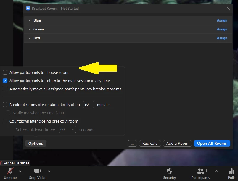 As a host I can add breakout rooms to the template meeting - actually their name and number. When the meeting starts, breakout rooms are created automatically. What I miss in this feature is saving the additional options - I want participants to choose their room, but every time I open the meeting I have to tick this option in checklist.