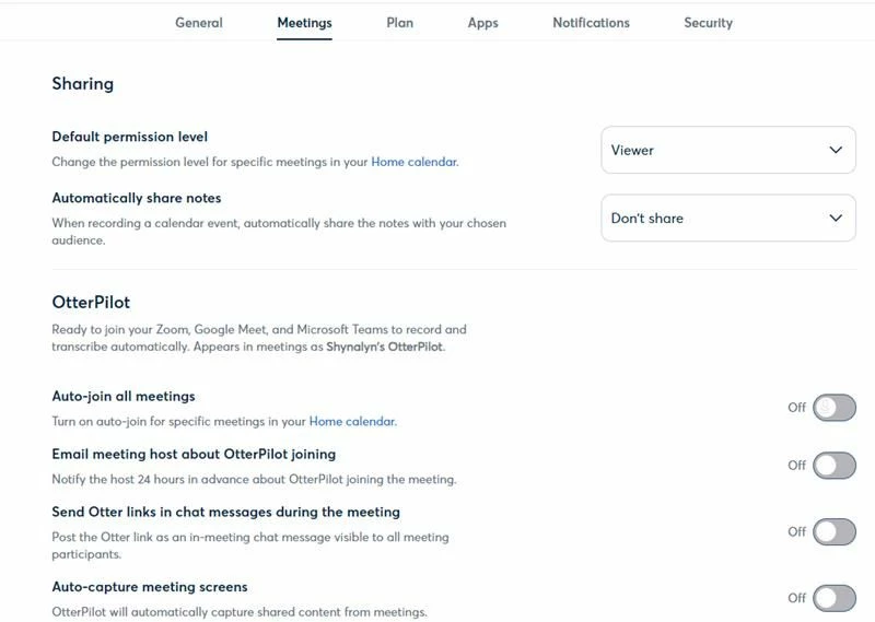 1. To stop your Otter from joining meetings automatically, here is what Otter's Help page says: "Click on your profile and navigate to Account Settings > Meetings. Under the Otter Assistant section, toggle off Auto-join all meetings. A pop-up will alert you to how many upcoming meetings Otter Assistant is scheduled to join automatically. Select Yes, turn them off to proceed with toggling off auto-join."