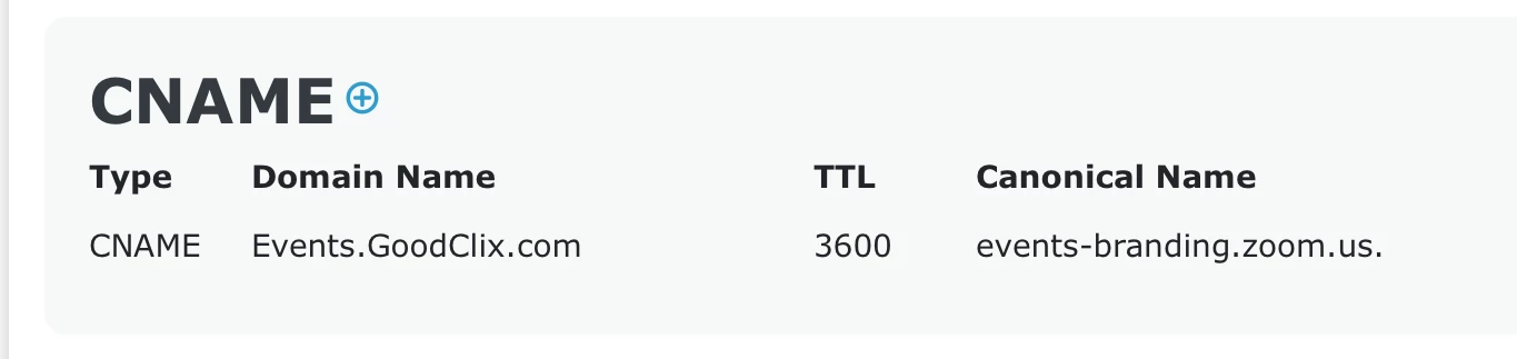 In my case, my main web site is GoodClix.com, and I want to use Events.GoodClix.com for the custom domain name. I’ll assume you’re doing the same by using a sub domain of your main domain. Make the CNAME record for the sub domain name you want to use as custom. In most DNS editors, this is done by adding the CNAME record to just the subdomain name; this is from dnschecker.com, which lists the fully-qualified domain name: