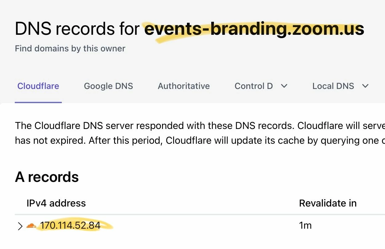 I'm trying to verify our domain name, and it seems like there's incomplete and conflicting information. The instructions in the verification popup give me a domain-level TXT record, OK that's done. Then it says it wants a CNAME to "events-branding.zoom.us," but doesn't give me a subdomain for that CNAME record. If I try to use "events-branding" as the subdomain for the CNAME record, then in the verification failure error message it says my A record was not found. But they didn't tell me to create an A record! And over in a help document, it says to create a different TXT record for a subdomain as well as an A record, but doesn't give me an IP address to point the A record to!
