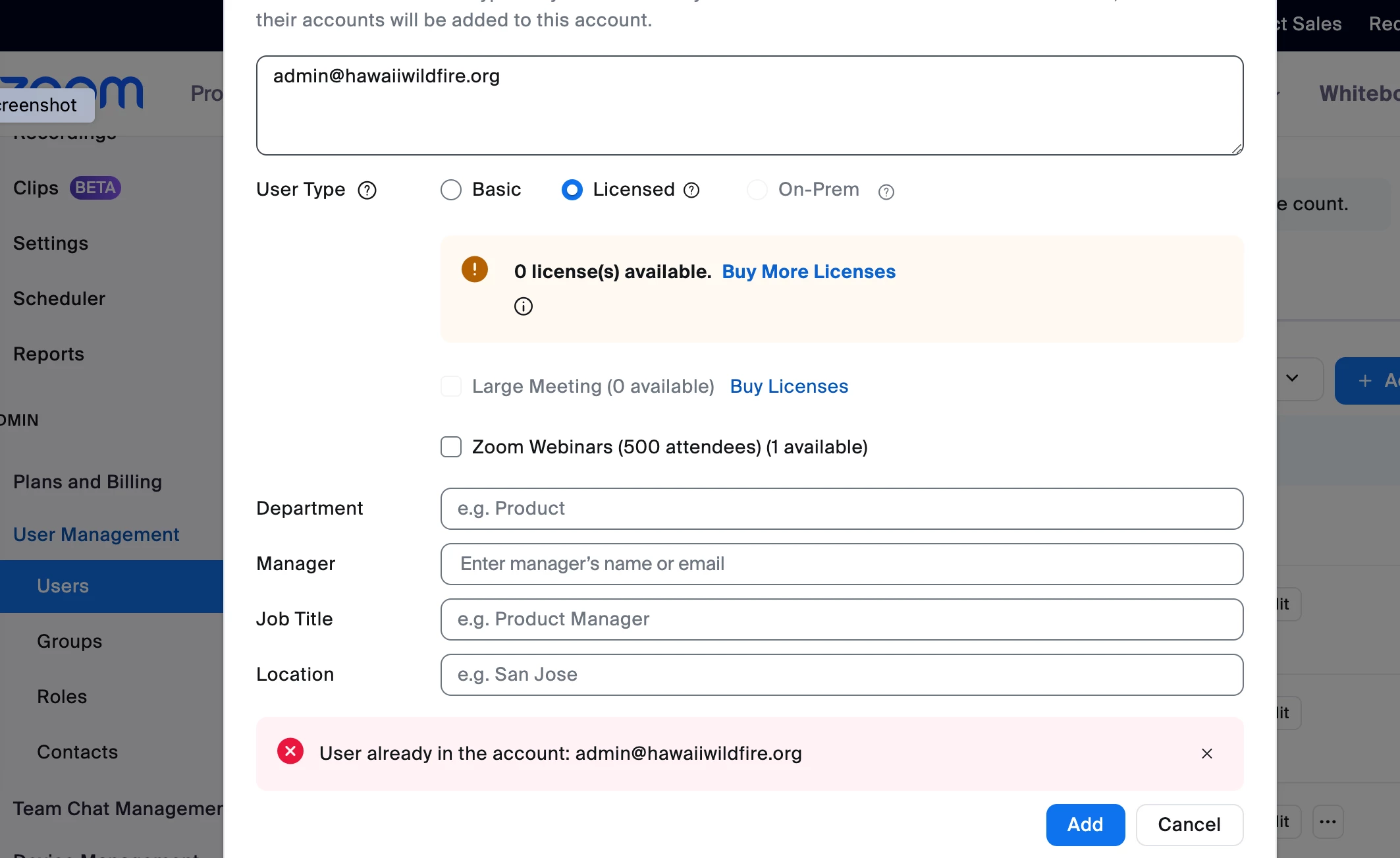 but when I try to add registered user under WEBINAR plan settings (I already tried exiting and re-logging in as ***********) it says this