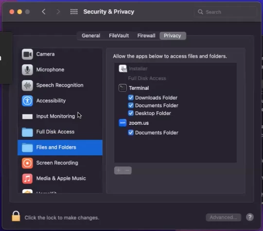 Hi all -- I am unable to install Zoom on my desktop Mac. I confirmed I'm downloading the correct version. I read through some of the other threads and allowed full disk access to Installer; however, I am unable to allow Installer access to files and folders (as suggested) -- it is grayed out. I've rebooted several times. Anyone have any ideas? I attached two screen shots -- one of the message I get when the installation fails, and one of the grayed out files and folder option. Thanks so much.