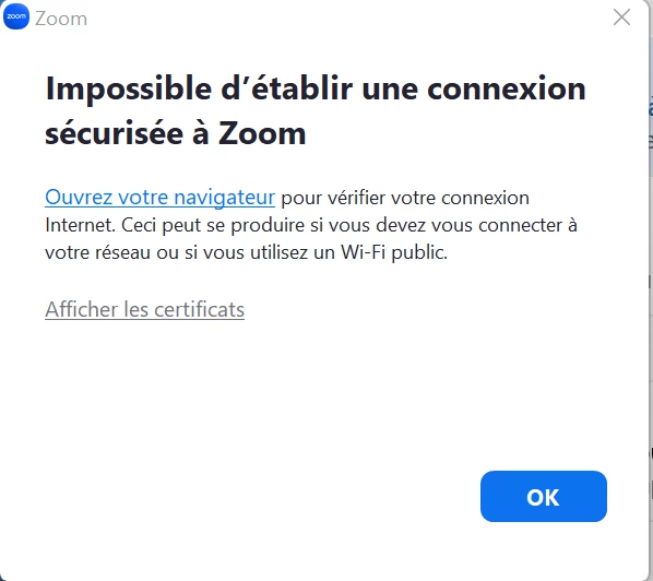 Je reçois ce pop up chaque fois que j'essaie de me connecter à Zoom.