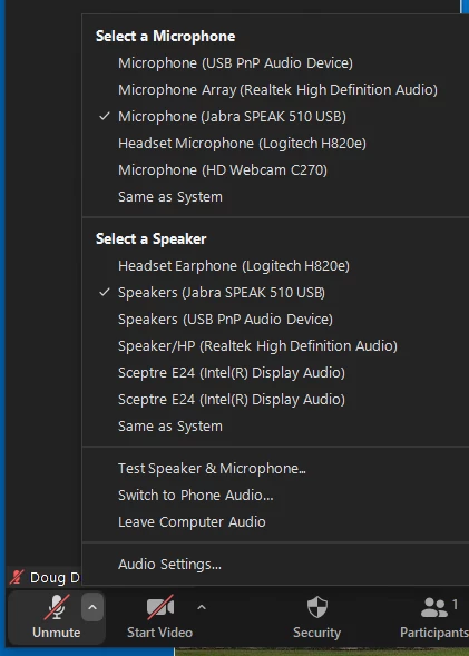 For example, I have a great USB Jabra speakerphone that I use MOST of the time. But, that tethers me to my desk. So, if I need to get up and let my dog out or something, I want to switch to my Logitech H820e wireless headset, take care of the dog, and then return to the speakerphone.